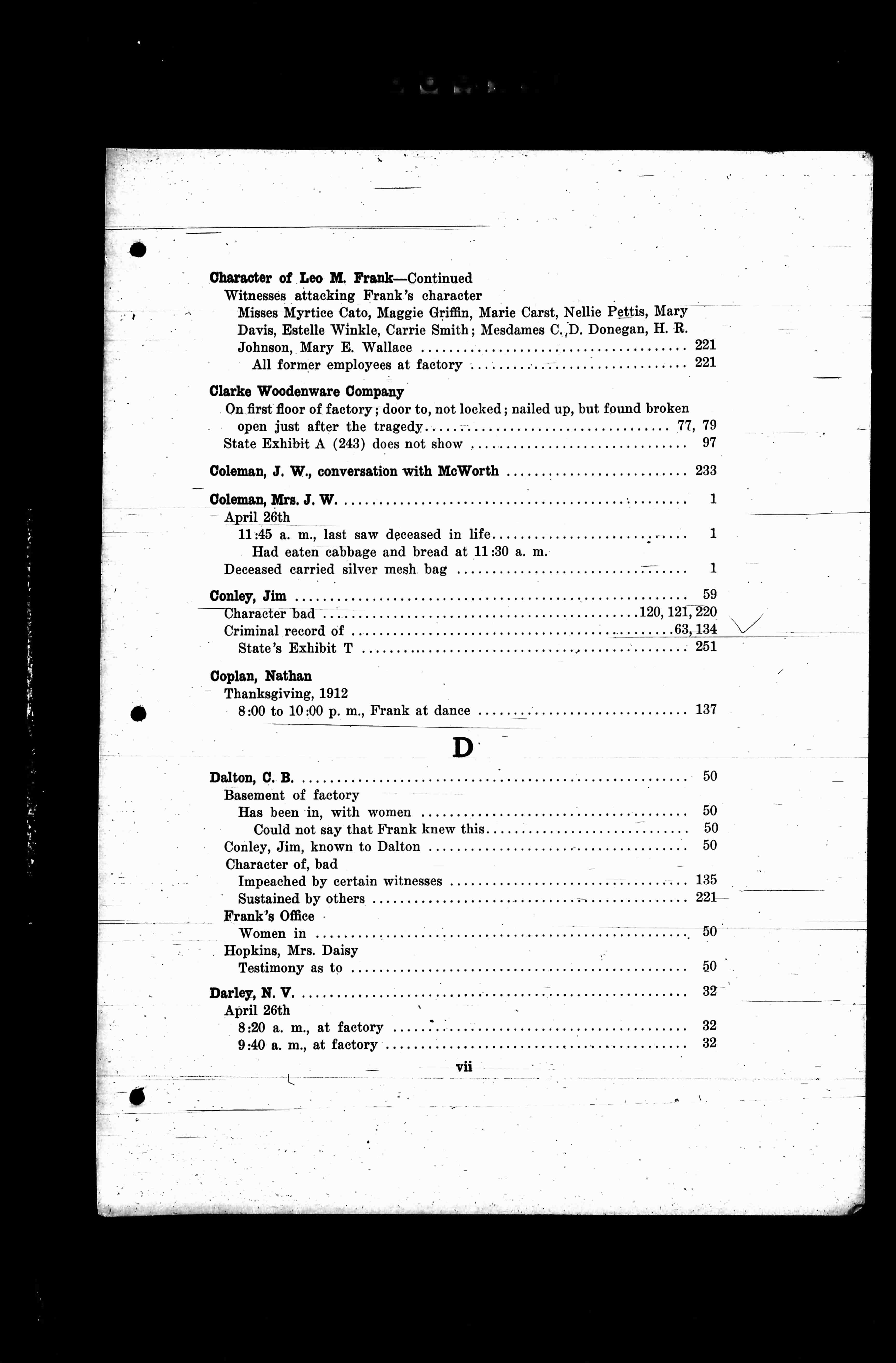 Visible Translated Text Is As Follows: Bailey, Gordon (Snowball), Page 136.April 23thDid not see Frank talk to Conley, Page 136.Character for veracity bad, Page 120.Conley, JimHas seen him reading newspapers, Page 136.Never saw him guarding doors, Page 136.Frank, Leo M.Never…