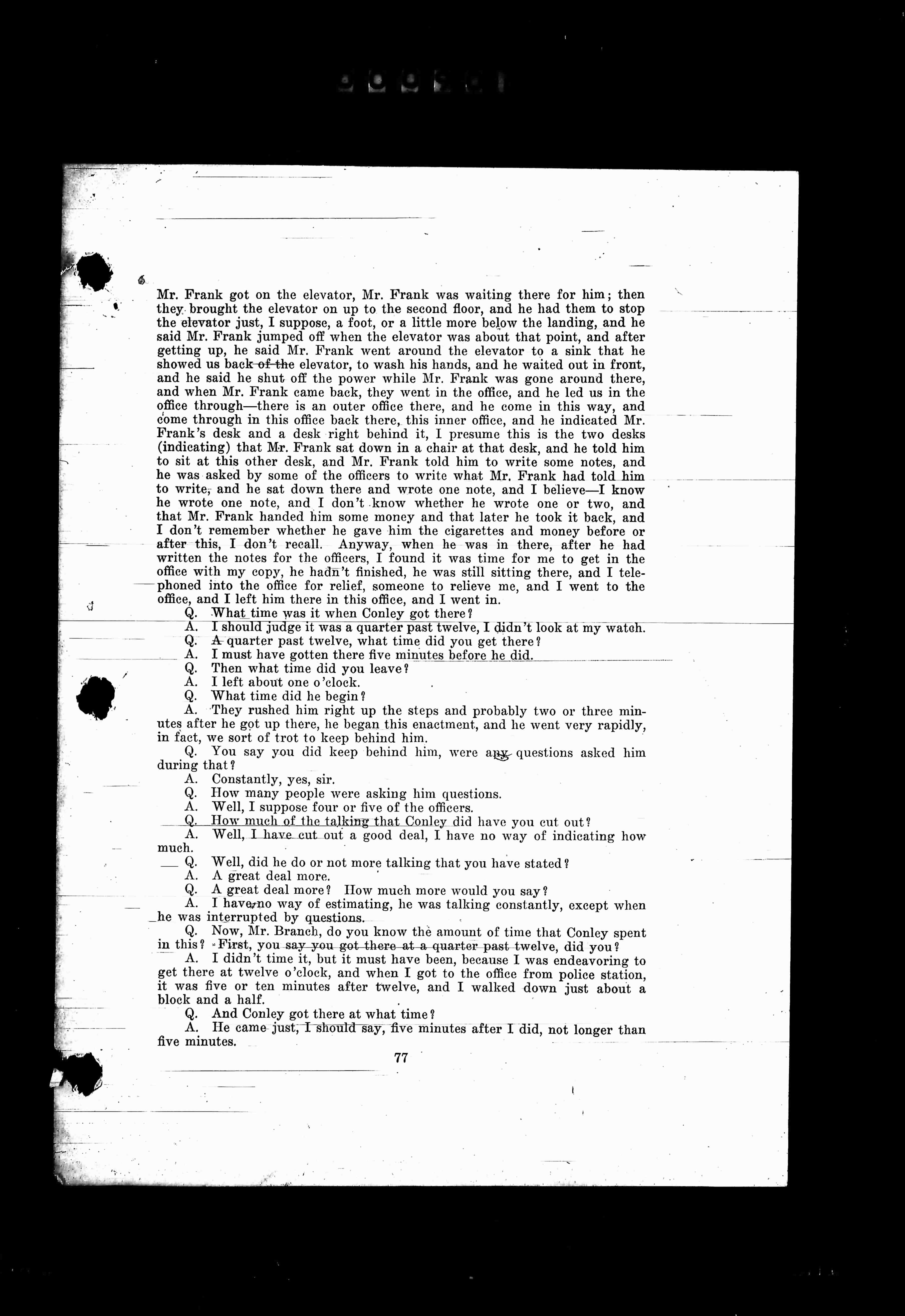 Visible Translated Text Is As Follows: Q. Who was undressing?A. Ermile Mayfield, and I came in the room, and while I was in there,Mr. Frank came to the door.Q. Mr. Frank came in the door?A. Yes, sir.Q. What did he…