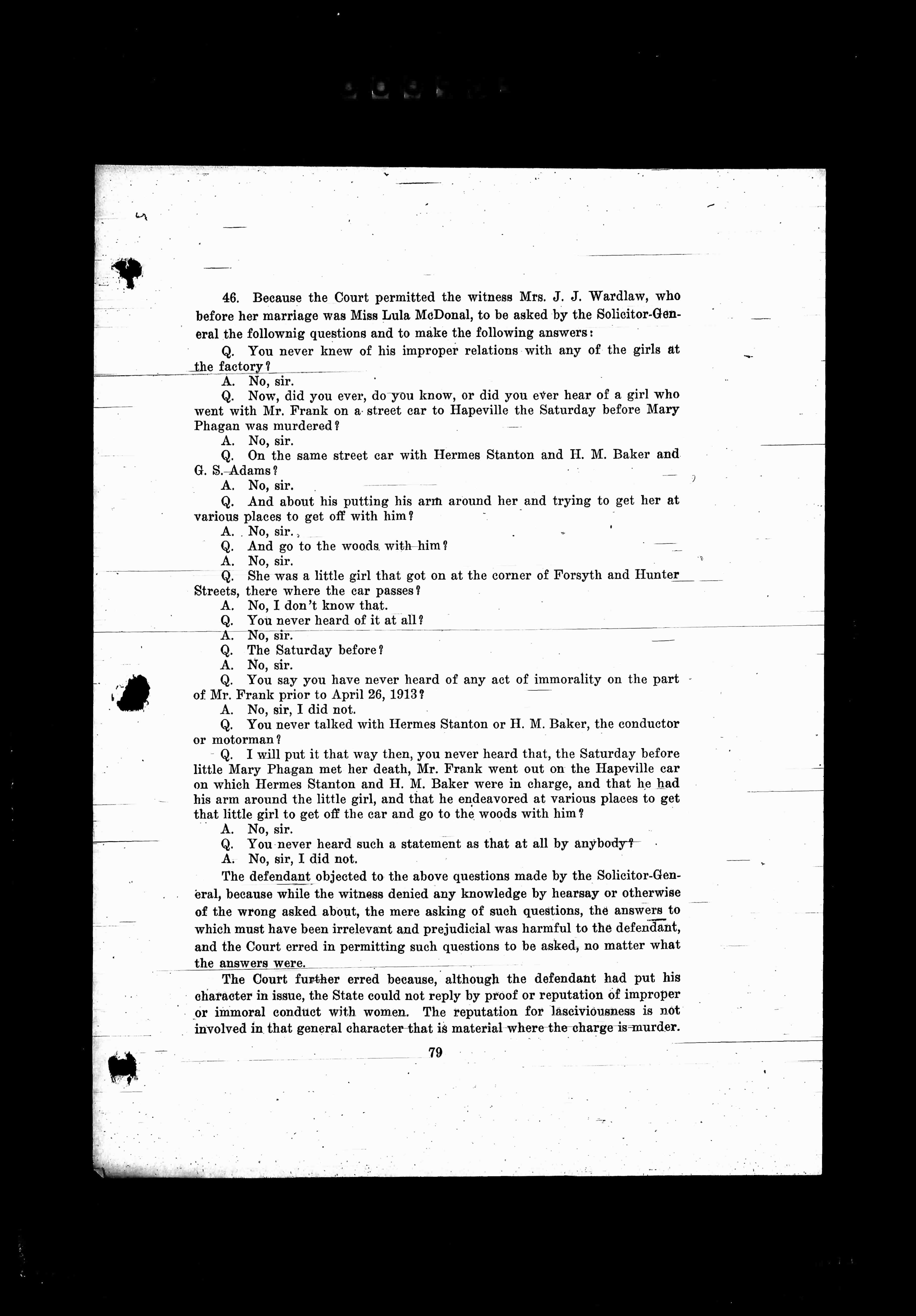 Visible Translated Text Is As Follows: 46. Because the Court permitted the witness Mrs. J. J. Wardlaw, who before her marriage was Miss Lula McDonald, to be asked by the Solicitor-General the following questions and to make the following answers:Q.…