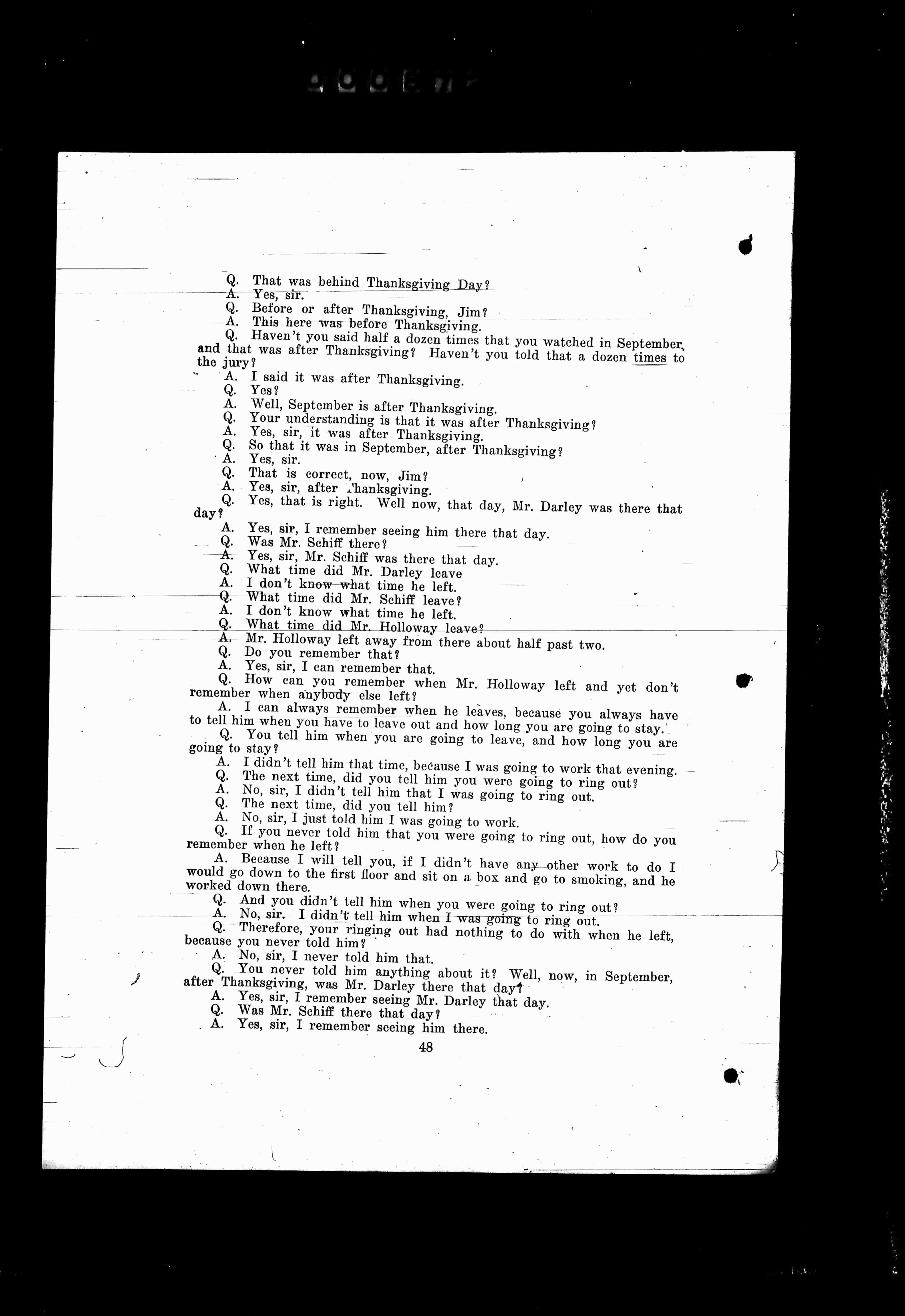 Visible Translated Text Is As Follows: Q. What time did Mr. Holloway leave?A. Mr. Holloway left away from there about two o'clock.Q. The next time you watched was right after Christmas?A. No, sir, the next time I watched was Thanksgiving…