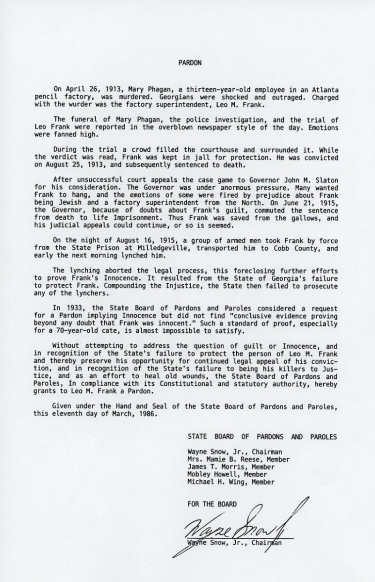Without attempting to address the question of guilt or innocence, and in recognition of the State’s failure to protect the person of Leo M. Frank and thereby preserve his opportunity for continued legal appeal of his conviction, and in recognition of the State's failure to bring his killers to justice, and as an effort to heal old wounds, the State Board of Pardons and Paroles, in compliance with its Constitutional and statutory authority, hereby grants to Leo M. Frank a Pardon.